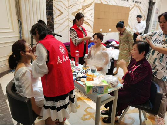 在社区新时代文明实践站迎来一对对携手几十载的老夫妻,社工为他们精心准备了化妆区和婚纱拍摄区,前来拍照的老年夫妇耐心的化着妆认真的挑选婚纱,试婚纱,穿上婚纱和西装的那一刻仿佛瞬间回到了年轻时刻,眼里充满了温暖和幸福。拍摄过程中,摄影师为了寻找最美的角度,一边拍摄一边造型指导,老人们都很配合,每一位夫妇摆好姿势进行拍照,时而牵手凝望,时而深情相拥……汤阿姨推着轮椅上的爱人对我们说:“以前没拍过婚纱照,没想到社区给我们提供了便利的条件在家门口就能弥补遗憾,可以见证自己和老伴相扶相伴的美好。”看到每一对夫妇站在摄影棚下微笑面对镜头,给予出最佳的状态时,工作人员很开心也很感动。